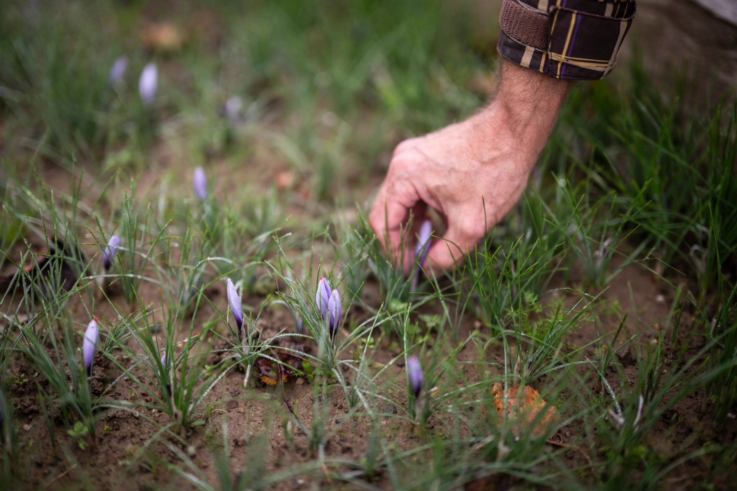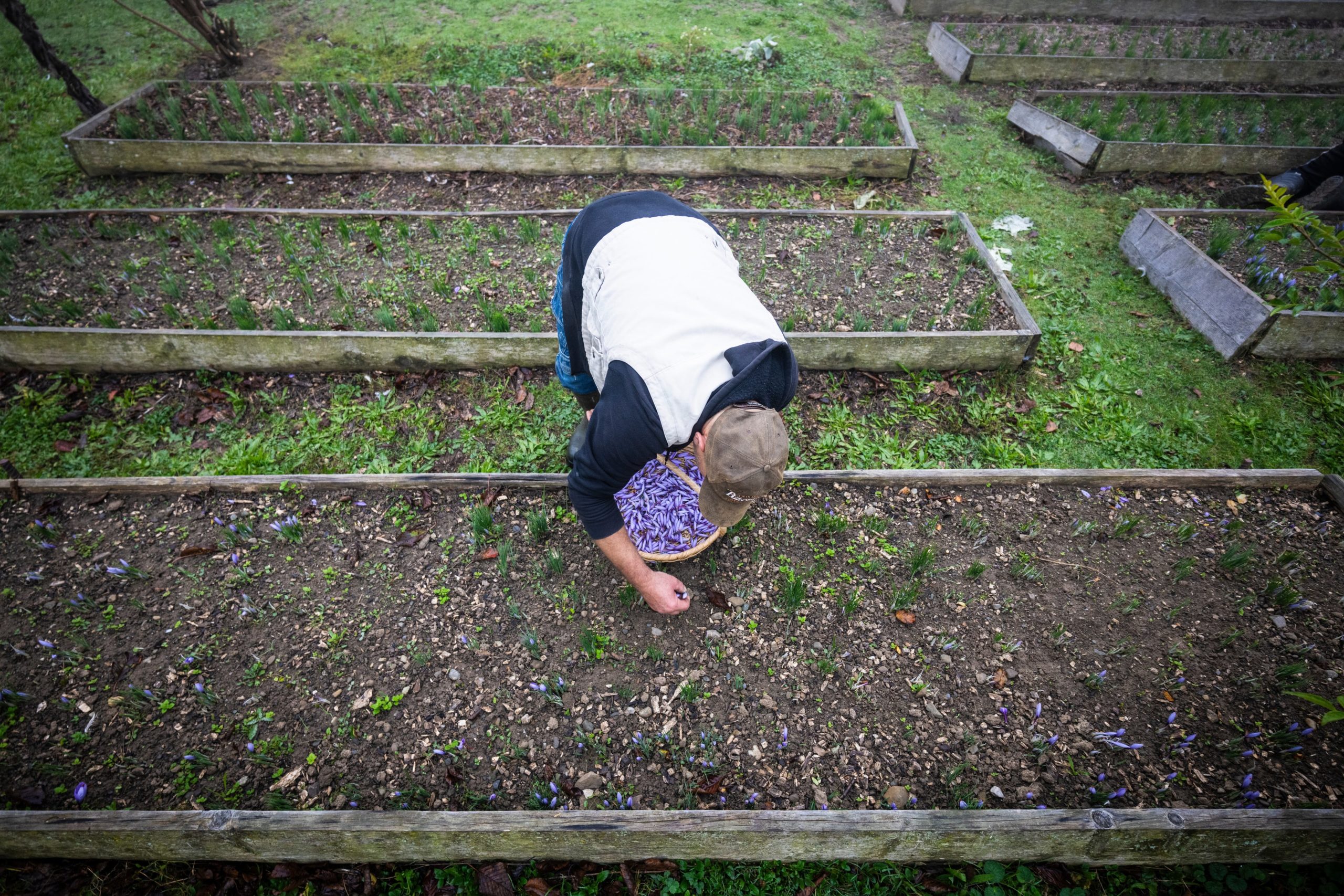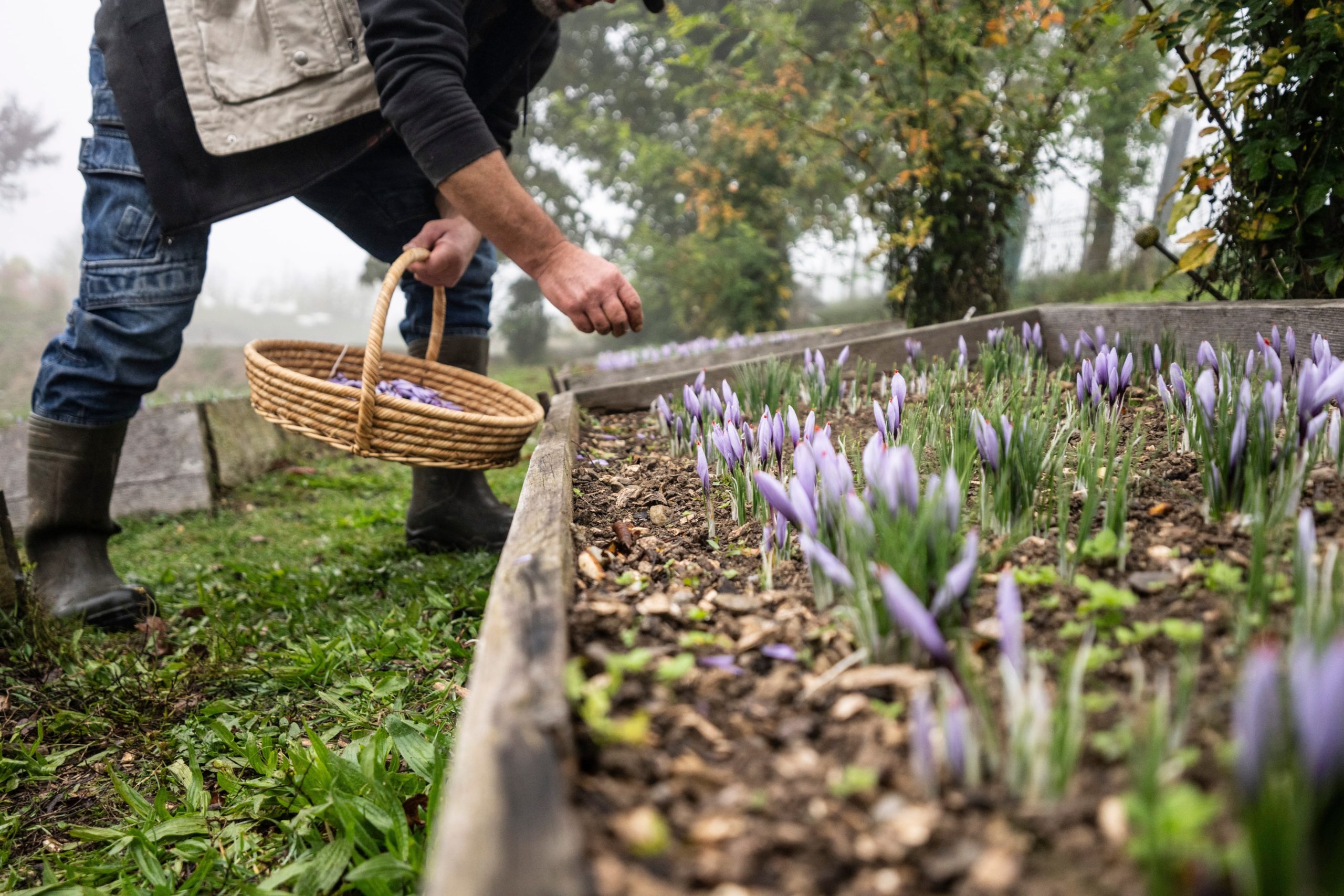A l’automne, quand les brumes matinales s’attardent sur les collines du Jorat, un spectacle discret se répète sur les hauts de la ferme des Cavin à Vulliens, dont la production est labellisée Bio Suisse et Demeter. Nichées au coeur de grands cadres en bois, les petites fleurs mauves, fragiles et mystérieuses, percent la terre encore froide. La floraison ne dure qu’un mois, à raison de quelques heures chaque matin, et c’est là que tout se joue. Avant que le soleil ne réchauffe la corolle et ne ternisse son parfum, les fleurs doivent être cueillies, encore fermées.