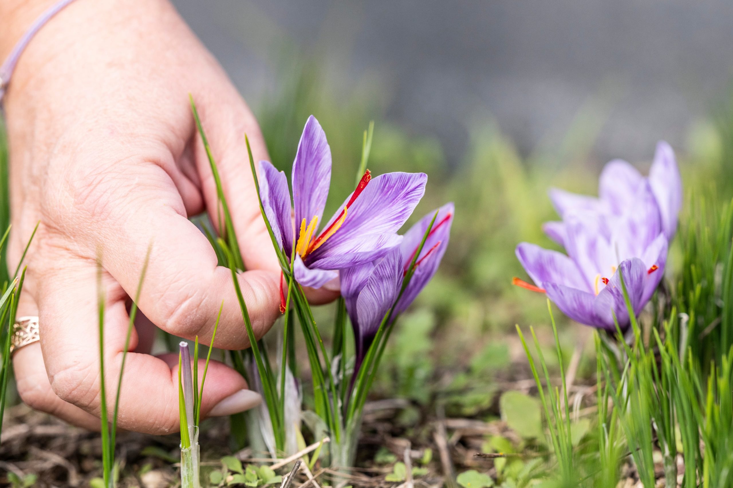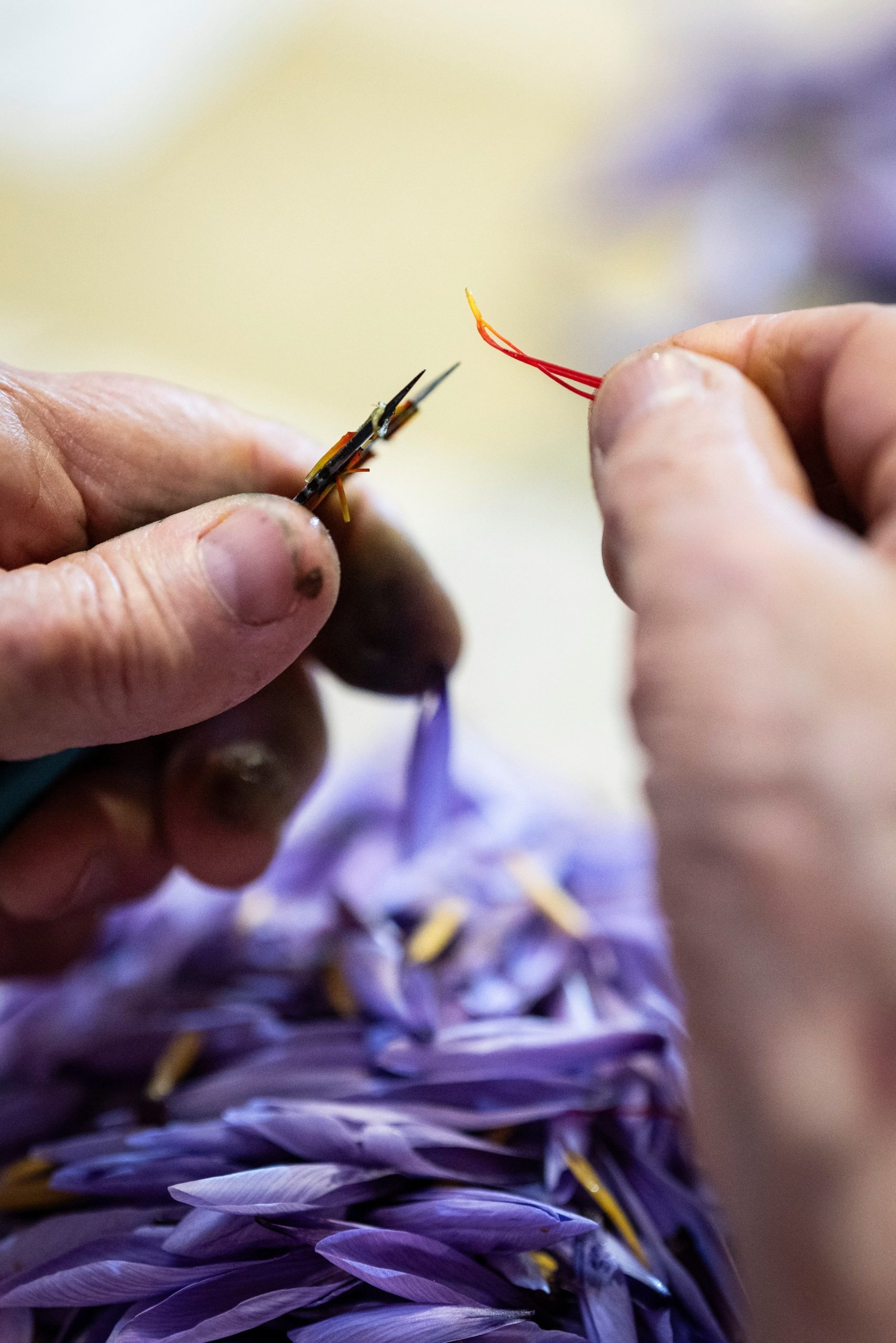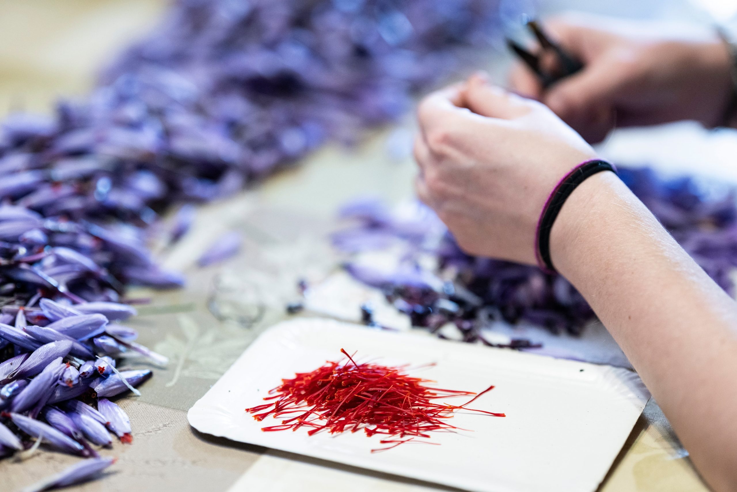 La récolte, concentrée sur un mois environ, demande une grande minutie : les fleurs sont cueillies à sec, souvent en fin de matinée, puis les trois stigmates, soigneusement extraits, sont débarrassés de la partie blanche amère et mis à sécher à l’air libre. Le feuillage continue de pousser tout l’hiver, avant de se dessécher en juin. C’est alors seulement que les bulbes peuvent être retirés, séparés et replantés pour assurer la pérennité de la culture.