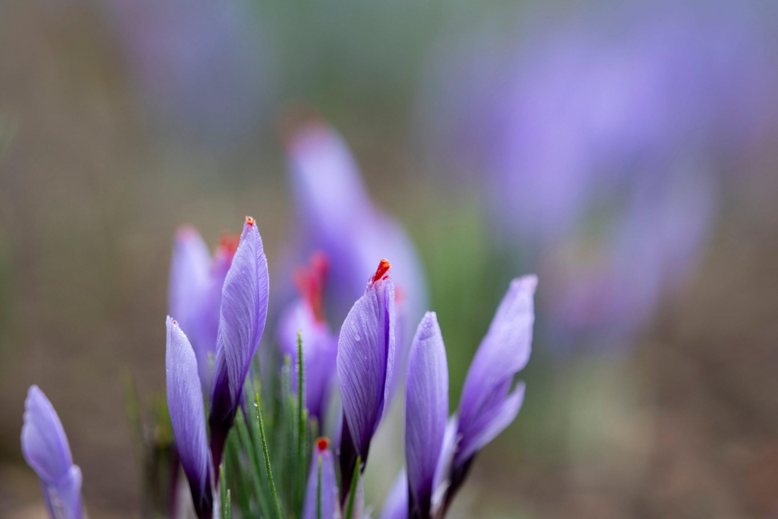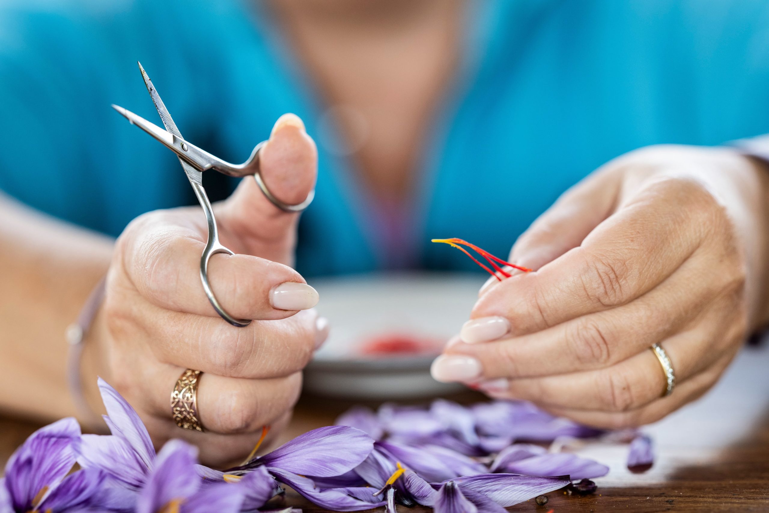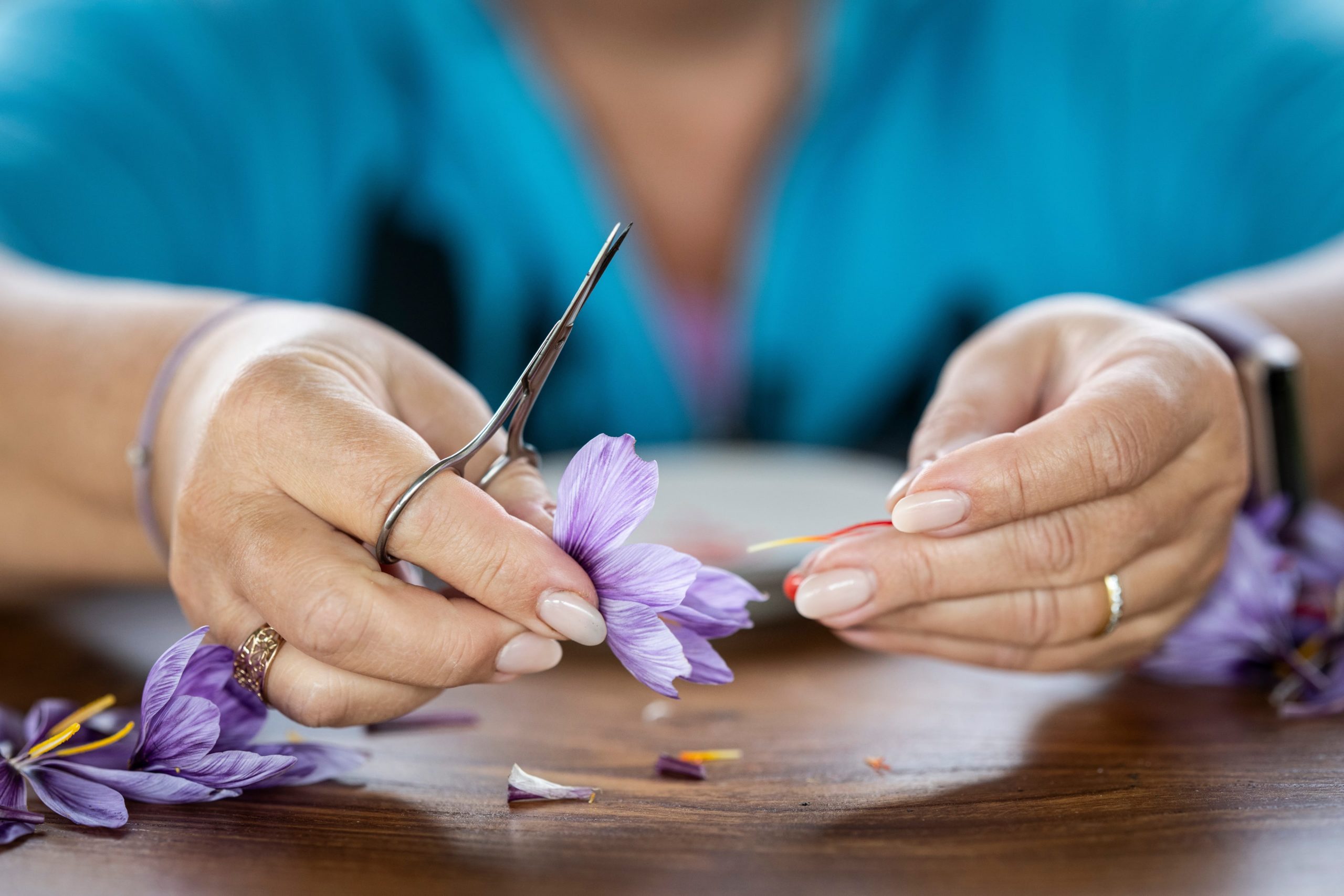 La récolte, concentrée sur un mois environ, demande une grande minutie : les fleurs sont cueillies à sec, souvent en fin de matinée, puis les trois stigmates, soigneusement extraits, sont débarrassés de la partie blanche amère et mis à sécher à l’air libre. Le feuillage continue de pousser tout l’hiver, avant de se dessécher en juin. C’est alors seulement que les bulbes peuvent être retirés, séparés et replantés pour assurer la pérennité de la culture.