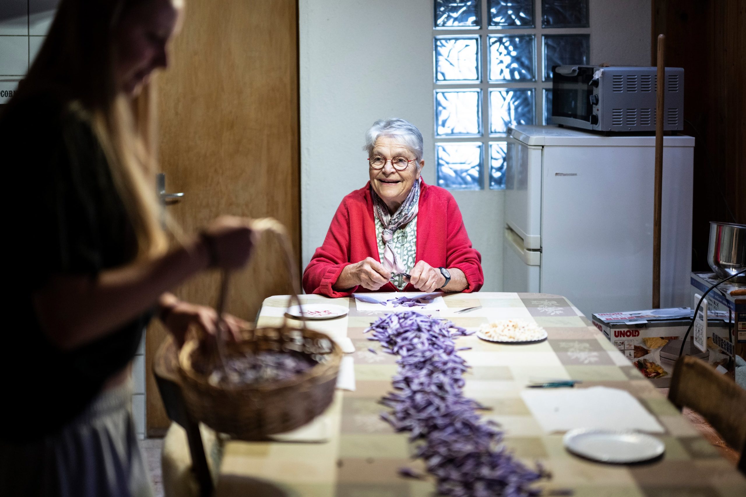 Après la cueillette vient le temps de l’émondage : un trio de voisins ouvre délicatement les fleurs pour en extraire les précieux filaments rouges. Le séchage s’opère au four à basse température, entre 35 et 50 °C, pour préserver les trois composés clés du safran : le safranal (arôme), la crocine (couleur) et la picrocrocine (saveur). Le safran repose ensuite au minimum un mois en pot hermétique pour développer toute sa puissance aromatique. Il est vendu à un prix qui reflète le travail minutieux, soit 50 francs le gramme.